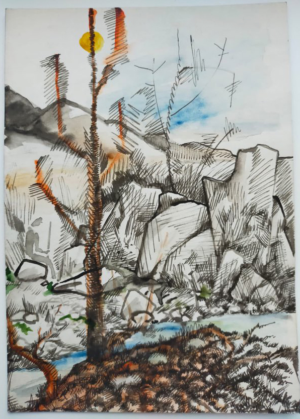 от берега обнаружил в скале некую выемку, вроде небольшой пещеры, заполненную водой. Он выполнял в этой пещере настенную роспись масляными красками. Это изображения святых и рисунки под ними.